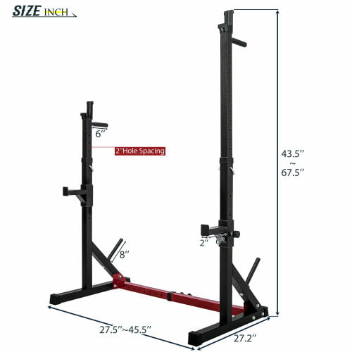 Simple but solid and effective squat rack, the best choice for your home gyms. Assemble dimensions: 27.5”~45.5” (L) x 19.5”(W) x 43.5”~67.5” (H)