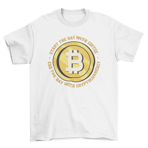 Check out this cool t-shirt design with the quote ‘Start the day with coffee end the day with cryptocurrency’.