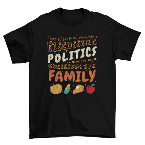 Awesome anti-thanksgiving t-shirt design featuring different Thanksgiving typical foods and the quote “Time to stuff my face while discussing politics with my conservative family”.
