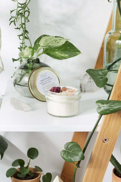 Meet , a pet, a job or a relationship. This candle is 4 oz of hand poured soy wax in a glass jar with a metal lid. This candle has a wood wick and is infused with organic essential oils to help relieve the feelings of grief.
