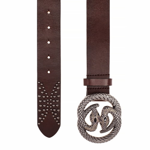 An intertwining snake belt buckle adds texture and interest to this women’s studded belt. Detailed with small domed studs on the strap and a single strap keeper to tuck in the end of the strap, the Snake Como Belt is crafted from full grain leather that gives it a rich look and feel. Graphite grey metal accents against a dark brown strap lend to its chic, contemporary appeal.