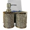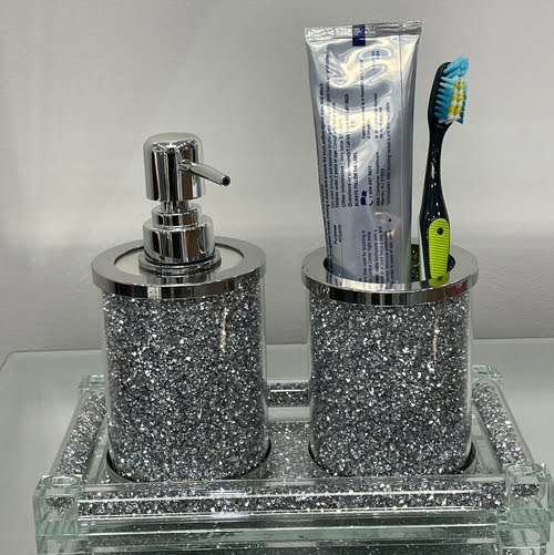 Exquisite three pieces soap dispenser and toothbrush holder with tray in a gift box. Features crushed diamond glass with chrome lid, base, and dispenser. Perfect accessory pieces to embellish your spaces, featuring great durability with a modern design and adding a chic touch to any kitchen or bathroom. Packaged in an elegant box, this is a perfect gift idea.