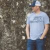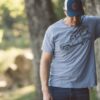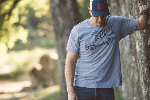 Black water based ink on Light Blue Heather 50/50 cotton poly blend. The softest, smoothest, best-looking T-shirt available anywhere.